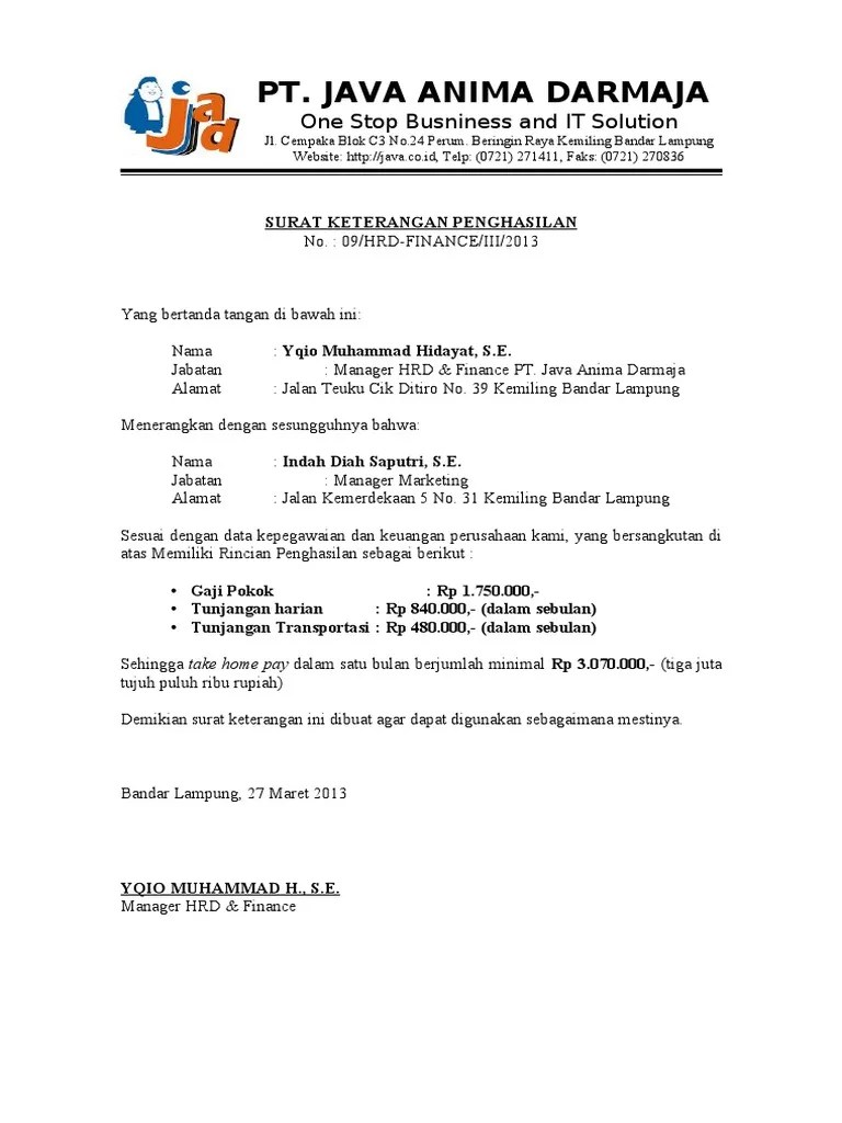 Berikut ini ialah sebuah contoh surat keterangan gaji.