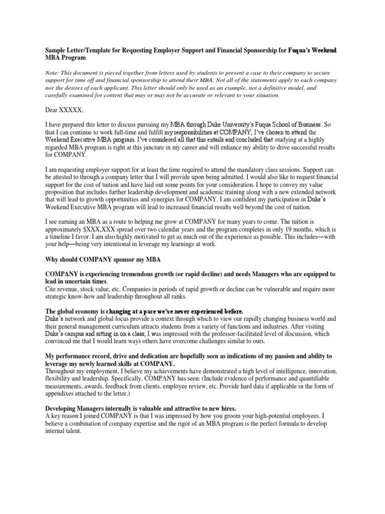Sample letter/template for requesting employer support and financial sponsorship for fuqua's executive.